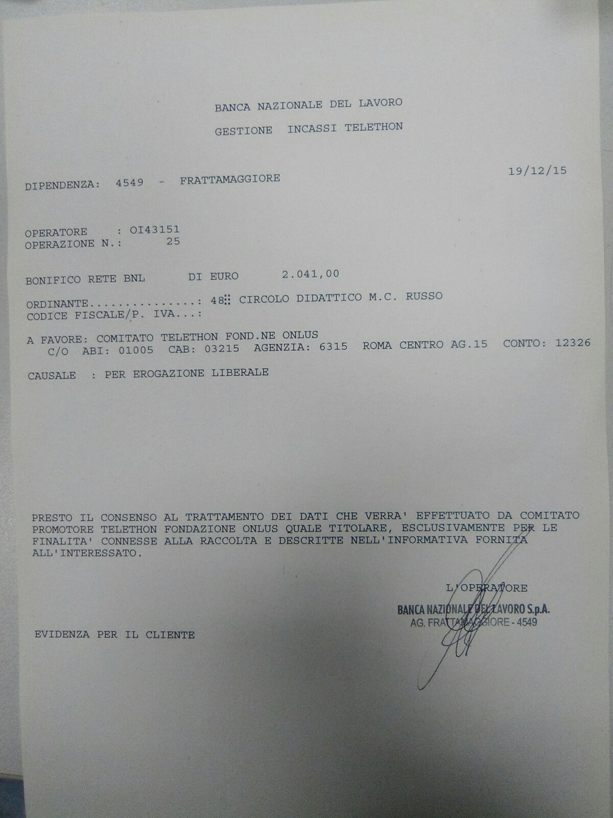 In data 19 dicembre p.v. sarà reso noto il nostro ricavato e consegnato ala BNL di Frattamaggiore.